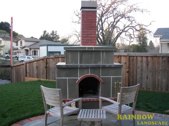 The custom designed outdoors fireplace was also built using solid concrete for both the foundation and the walls. It has a natural gas line as well. The fireplace has a bluestone and red bricks finish just like the stone patio. The back wall of the fireplace has a stucco finish.
