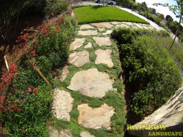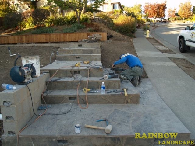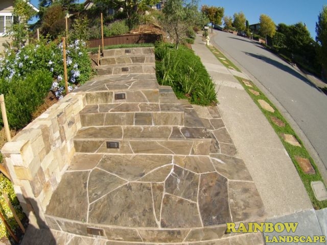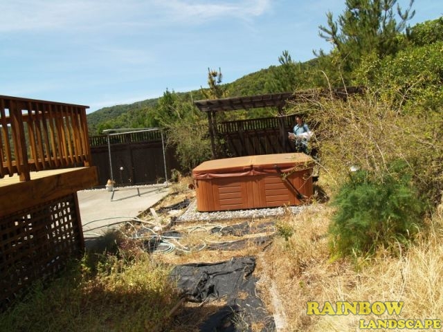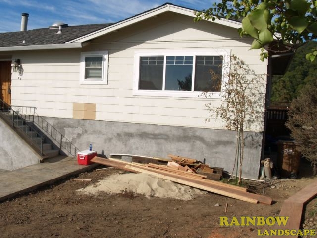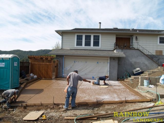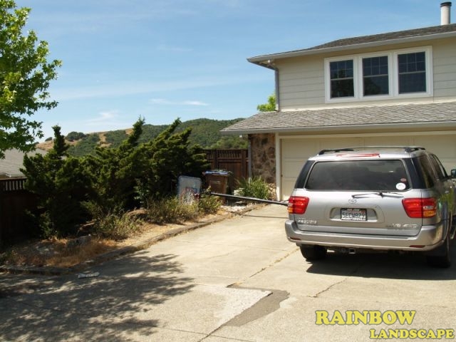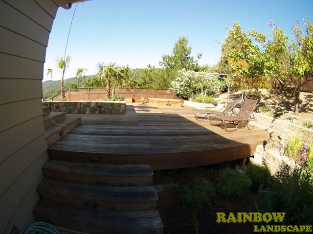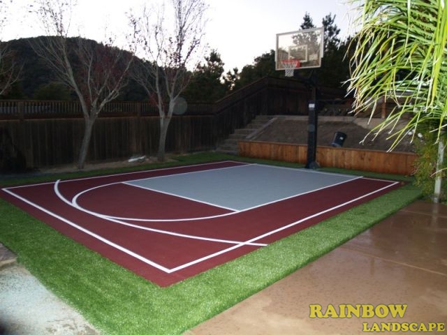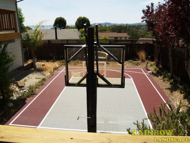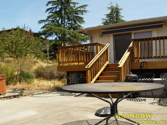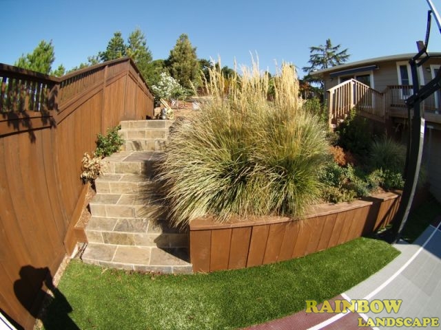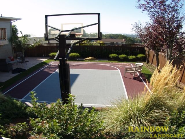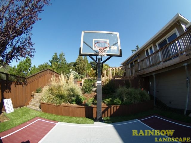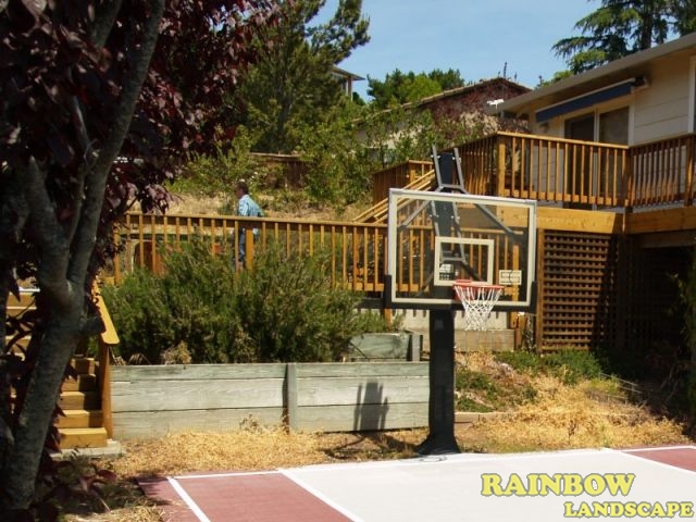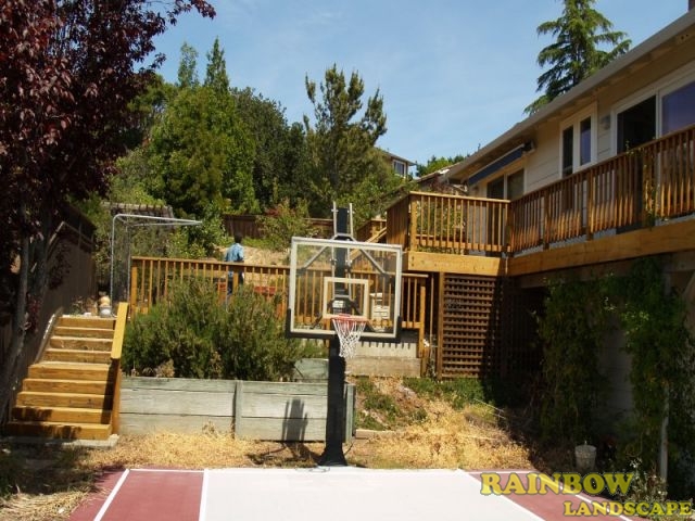 Rainbow Landscape Irrigation & Maintenance (landscape contractor) did a hardscaping and landscaping project involving the front yard, backyard and side yards of this property in San Rafael, Marin County, California. This landscape project included the following: artificial grass around basketball court, colored concrete driveway, garden lighting, irrigation system, mulching, natural sod for the front yard, natural stone finish, planting, redwood stairs, step stones, stone pathway, stone patio, stone stairs, wood deck & wood trellis.