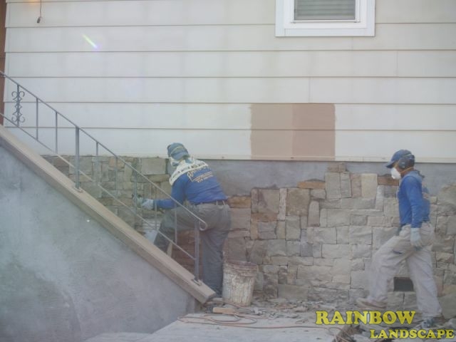 The final phase of the project included the front yard landscape and hardscape. We started by removing the existing driveway and lay out a new driveway with colored concrete and increased the size of the driveway. We resurfaced the lower part of the front wall of the house with natural stone finish. Then we built the stone stairs with garden lights built-in and the stone pathway leading to the east side yard. We graded the dirt area in the front yard and then we did the installation of natural grass with a sprinkler system. Planting and drip irrigation system for the new plants, more garden lights and mulching the topsoil areas completed the front yard landscape project.