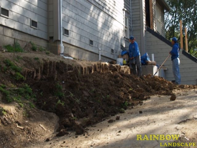 For the backyard, new natural grass was laid out, a bluestone patio and a wood fence were built. An irrigation system to water the new lawn. For the front yard, the landscape plan included a large veneer stone retaining wall. We started with grading the surface for the first time. Then we installed the drainage. Then we did a second and final grading. The next step was to build the engineering retaining wall with veneer bluestone finish. We planted some plants with a drip system for proper watering. The last thing to do was mulching the topsoil areas.