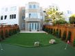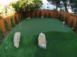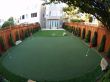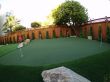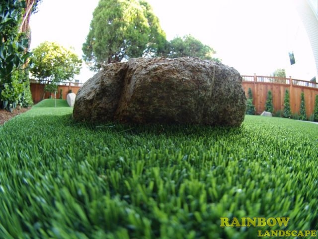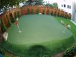 Now it was time for the installation of the 420 sqft of putting green with 4 holes and fringe finish. Each hole of this putting ground has an underground garden light. We installed 440 sqft of artificial grass between the putting green and the stone patio. This artificial grass lawn was intended to be used as a playground area and the client had a trampoline already to be placed on this area. Garden lights were strategically installed to light up the entire backyard at night. To add a more natural touch to the artificial lawn and putting green, 6 boulder stones were placed on different spots. To finish off this landscape project, we planted trees along the perimeter of the redwood fence with an irrigation system to water these trees. And finally mulching the exposed topsoil areas.