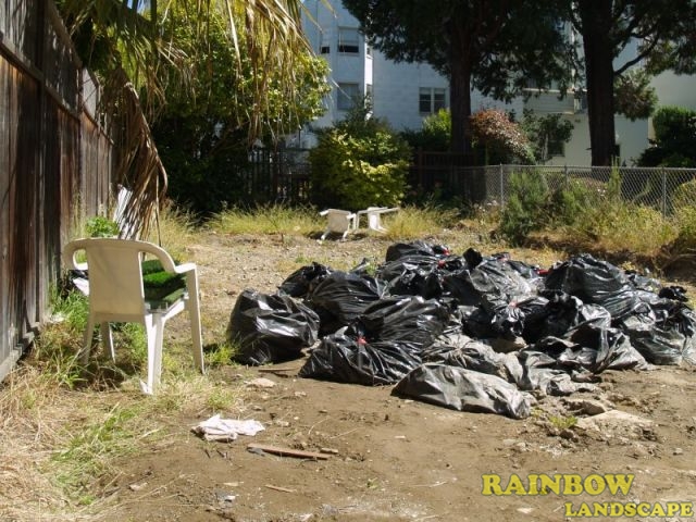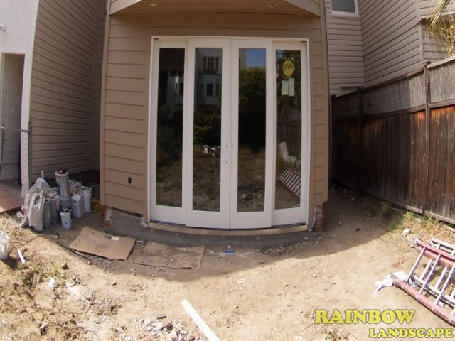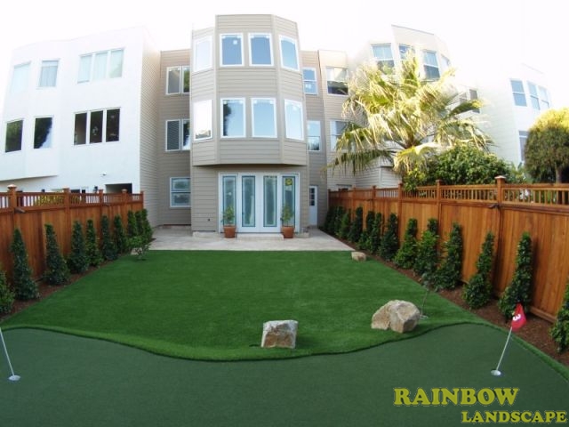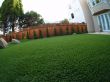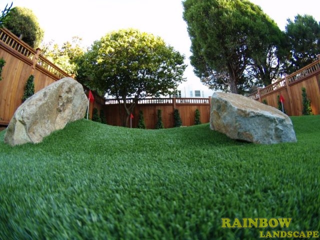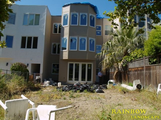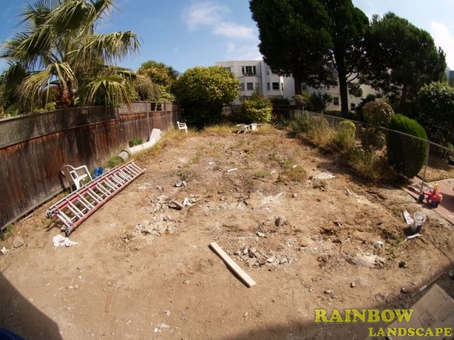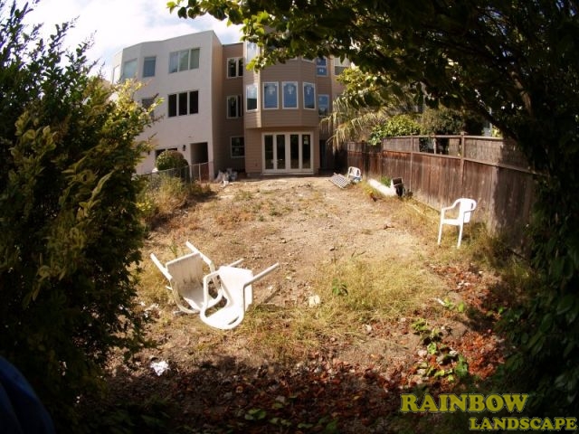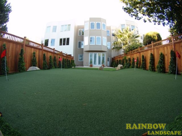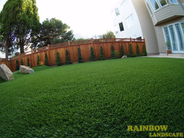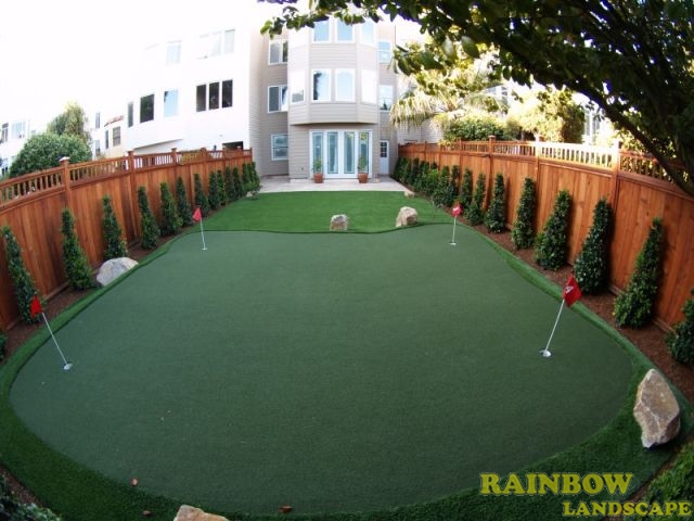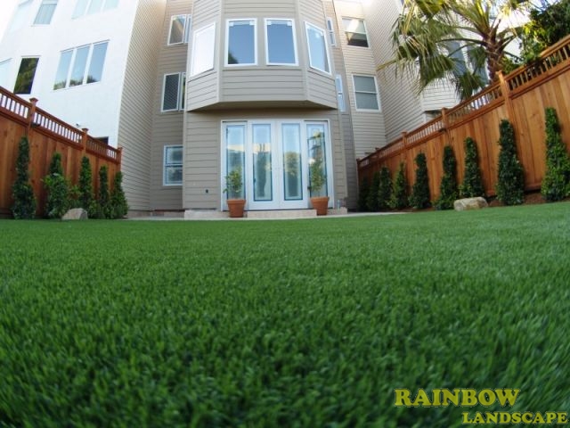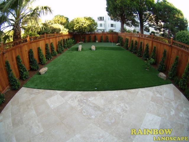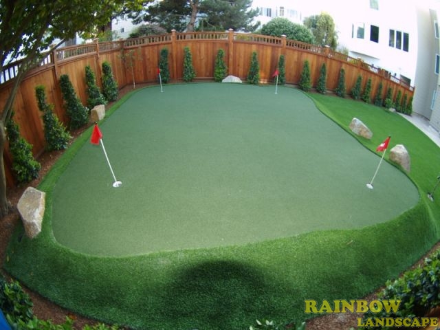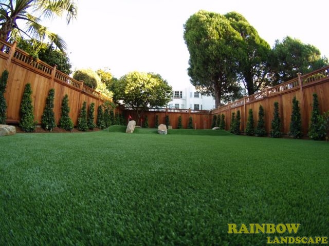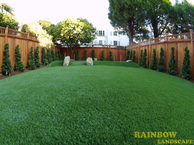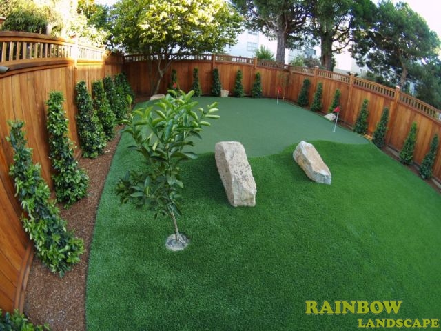 Rainbow Landscape Irrigation & Maintenance (landscape contractor) did this landscaping project in the city of San Francisco, Bay Area, California. This backyard had no landscape at all, it was covered entirely by dirt and some weeds in the far backside. There was an old and deteriorated wood fence along one side of the backyard and a chain link fence along the other side of the backyard. The homeowner required an entirely new landscape involving a redwood fence surrounding the perimeter of the backyard for privacy, artificial grass to reduce water use & cost, also to support a trampoline, a putting green area to play minigolf at home, trees with drip system, mulching and garden lighting.