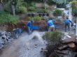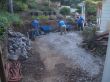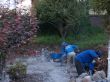 In order to extend the playground area to the desired square footage we needed to push back the existing retaining wall in the lower level. First, we started by removing the existing brick patio and dumping away all the removed bricks. Then we had to take down the stone retaining wall in the lower level. There is a stone staircase in the middle of the backyard with a pergola on top of the lower steps. We removed the bottom steps and carefully took the pergola off the ground to relocate it forward. We did a surface grading, then we started building a french drainage, and then a second grading was done.