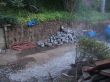 We started building a new stone retaining wall using the removed stones from the previous retaining wall. Also, a new wood retaining wall was built as well. The pergola was placed back on top of the last step from the existing stone staircase. And then the final grading for the surface was done to proceed with the installation of a new stone patio & natural grass with an irrigation system to water the new sod.
