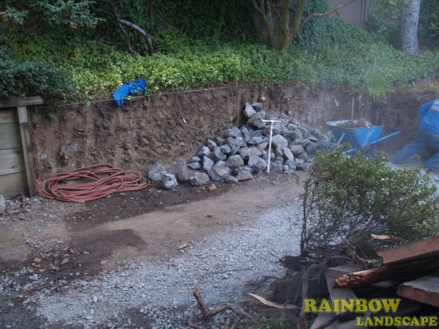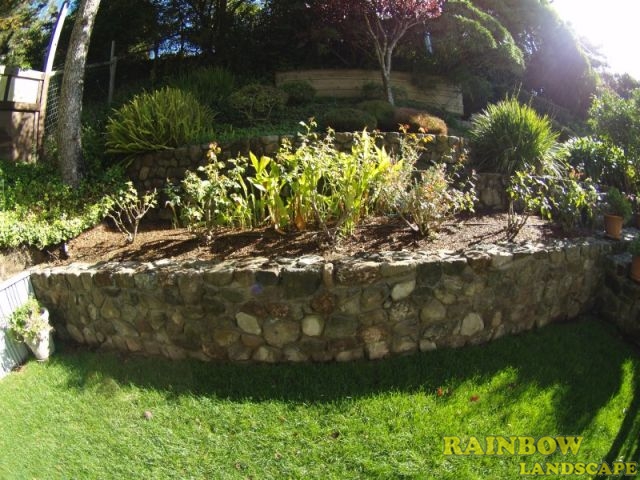 Irrigation system, mulching, patio, planting, pergola, sodding, stone & wood retaining walls.