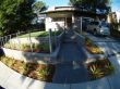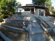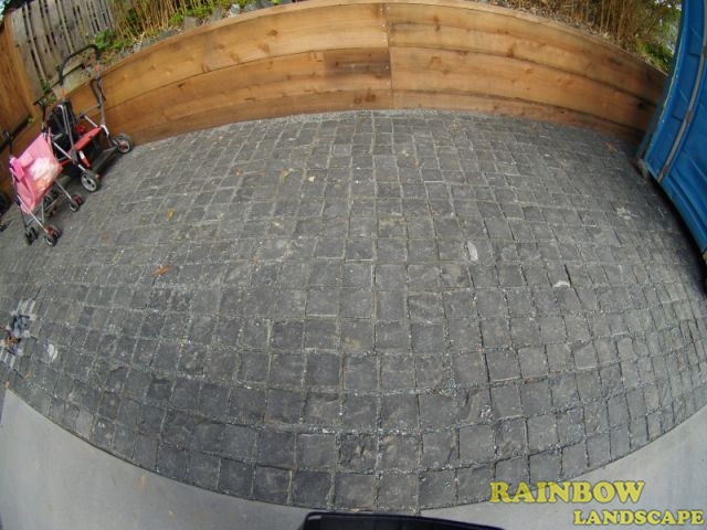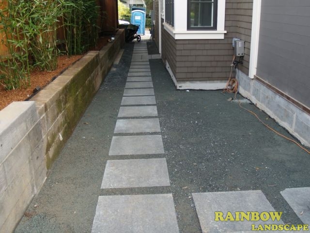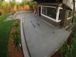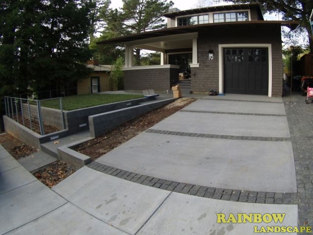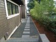 For the front yard, the following work was done: a new driveway was built where 2/3 of the area is a concrete surface and the remaining 1/3 of the area has 4" x 4" x 4" black basalt cobble stones. Also in the concrete area of the driveway, we laid out 4 strips of 4" x 4" x 4" black basalt cobble stones horizontally. The stairs were made of concrete with sand sitting, and then we installed 48" x 6" x 6" black basalt stones on the 5 stair treads with built-in garden lights in the walls on both sides. These stairs were built with the purpose to connect the sidewalk with the main entrance door. Concrete garden beds were built, which were later filled with new topsoil, shrubs were planted and then redwood mulch was applied. A drip system was installed to water the shrubs with only the necessary water. A mesh fence was installed in a portion of the front yard, just to cover the front of the lawn area. This lawn area has natural sod with drainage and an irrigation system. Also a 12" x12" x 2" black basalt stone walkway with sand sitting was built to connect the main door area with the left side yard.