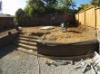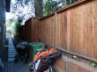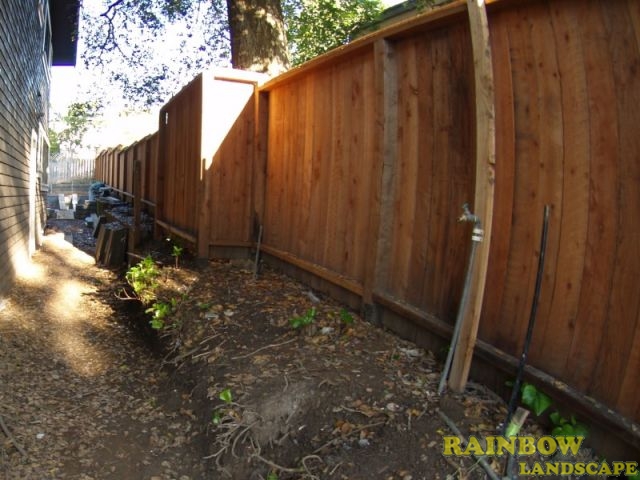 Side yards: on the right side yard, the existing wooden fence was removed and a new redwood fence measuring 110 ft long x 6 ft high was built going from the garage door to all the way back of the house. In both side yards, decomposed granite was spread on the surface and square-shaped step stones were placed along the house from front to back. In the left side yard, a garden bed was built between the house and the neighbor's house where privet plants were planted to grow as a privacy screen and then this area was mulched using 1/4" redwood mulch. Also, a new redwood fence measuring 40 ft long x 6 ft high was built to cover a partial area on this side of the property.