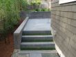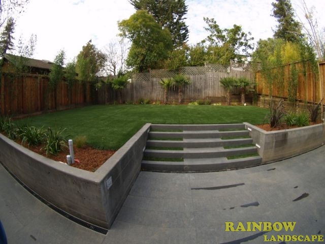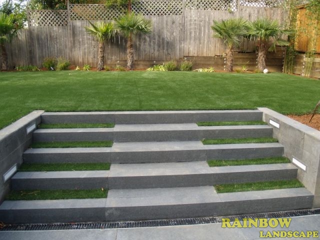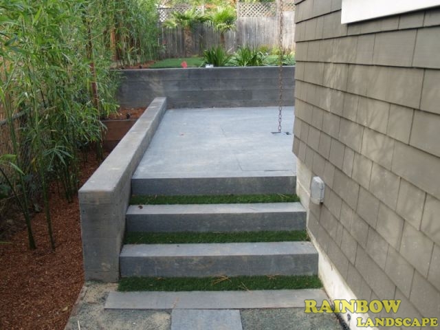 The backyard was totally changed, we started by grading the surface in two ground levels and hauling away the entire removed dirt. Concrete retaining walls were built to separate both levels. Unlike the front yard, the homeowners decided to have artificial grass installed in the upper in the upper level of the backyard to save money in the long run by considerably reducing water use and maintenance labor in the backyard. The type of artificial sod installed was PP-80 Fescue Blend from Better Than Real Artificial Grass (www.BetterThanRealGrass.com). Then concrete stairs were built and we installed 48" x 6" x 6" black basalt stones and artificial turf on the 5 stair treads. We also installed built-in garden lights in the walls on the sides. These stairs connect both upper and lower levels. A space of 4-ft surrounding the artificial lawn was left for planting dwarf palm trees, privets and shrubs, and then we applied redwood mulch in this 4-ft strip. These plants added a dry tolerant landscape to the upper level making it look completely natural with the artificial lawn while saving water for landscape use at the same time. A stone patio with 48" x 14" x 2" black basalt stones with sand sitting was built on the entire lower level.
