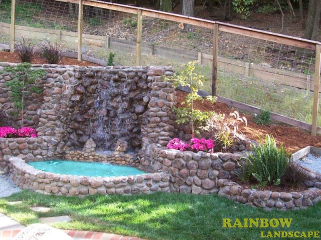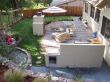 BBQ grill, fireplace, garden lighting, irrigation system, mulching, planting, stone patio, waterfall
