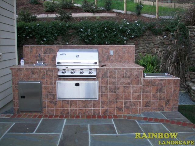 The first thing we did was the drainage. The next step was building the outdoor custom designed backyard patio with a combination of bluestones divided with lines and a border of red bricks. This patio design also included a couple of stone stairs leading to the backdoor. Then we started building the outdoor custom designed barbecue island using solid concrete for both the foundation and walls. The outdoor custom designed BBQ set up had both countertop and walls finish done with Santa Cruz tiles. The outdoor BBQ set up has a stainless steel grill powered by a natural gas line, side burners, sink, & utility cabinets. Also included is an electrical line with a power outlet to plug in electrical devices to enhance the cooking experience.