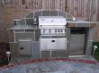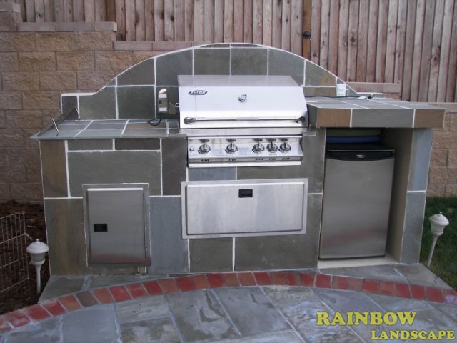 The outdoor custom designed BBQ set up was built using solid concrete for both the foundation and the walls. The features of this outdoor custom made BBQ set up are: natural gas line for grill, power line to plug in electrical devices, stainless steel grill and utility cabinets, stainless steel fridge. The countertop and walls have a bluestone finish to match up the recently built outdoor stone patio.