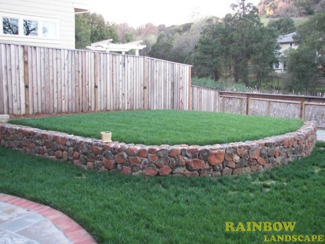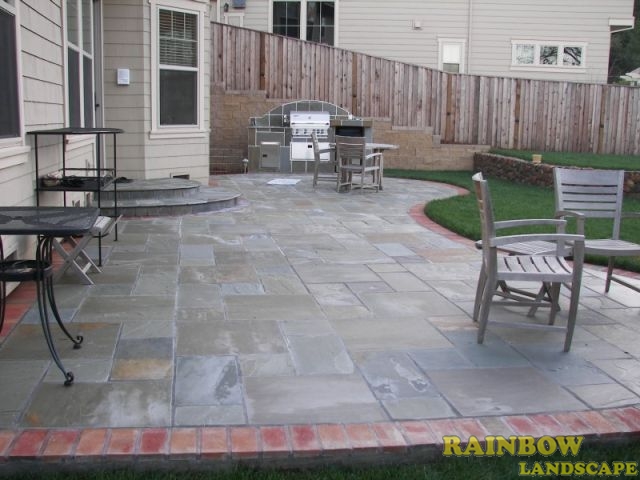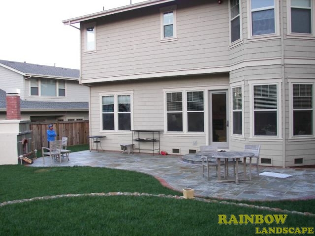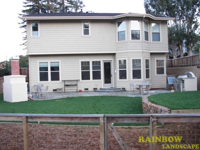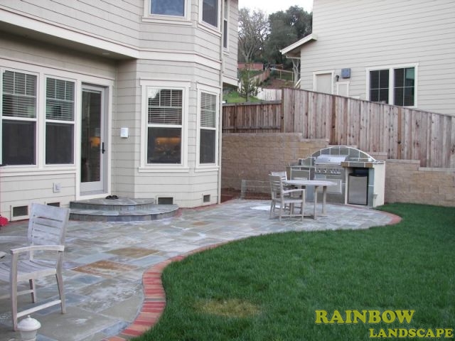Rainbow Landscape Irrigation & Maintenance (landscape contractor) did this hardscaping & landscaping project in the city of Novato, Marin County, California. The entire backyard surface was graded and then construction of the outdoor custom designed patio began. We started with the concrete foundation and then completed the outdoors patio with bluestone finish with red brick border.