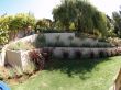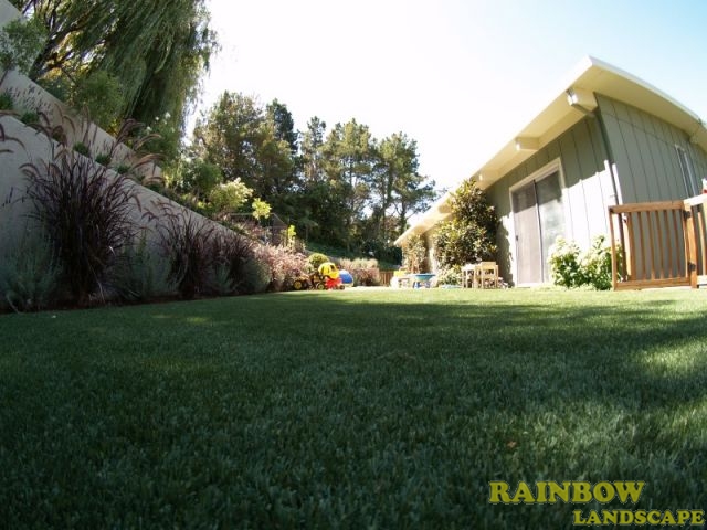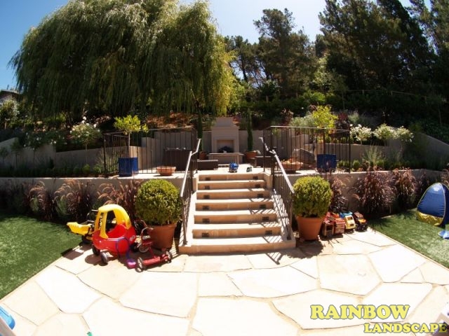 This job involved building engineering retaining walls in two different levels of the backyard, artificial grass installation for the entire lawn area; two stone patios, a flagstone patio in the upper level, a flagstone patio in the lower and flagstone stairs with built-in garden lights to connect both flagstone patios; a garden lighting system to light up the entire backyard; mulching, planting a lot of ground covers, plants, shrubs & trees with a drip system. Once this landscape project was completed, the homeowners were so excited and satisfied, they hired Rainbow Landscape to provide garden maintenance services to this property.