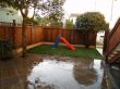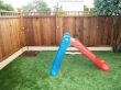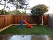 Artificial grass installation for playground area, redwood fence, retaining wall & bluestone patio.