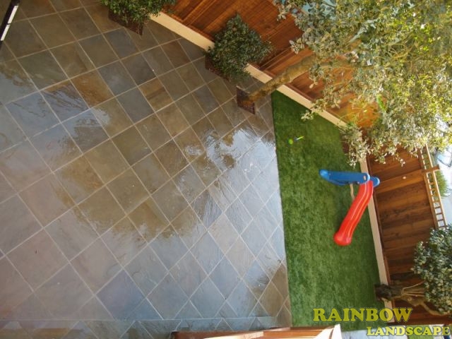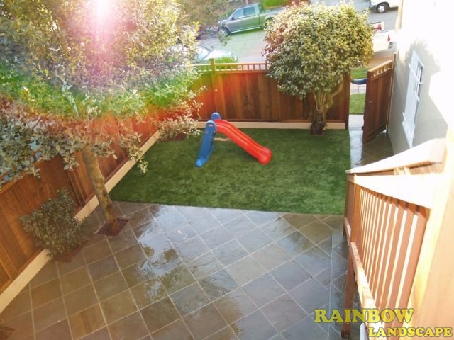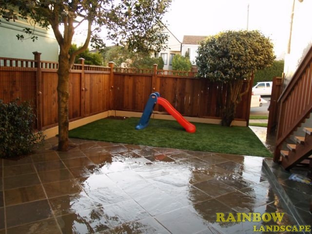 Bluestone patio with playground artificial grass in San Francisco, Bay Area, California.